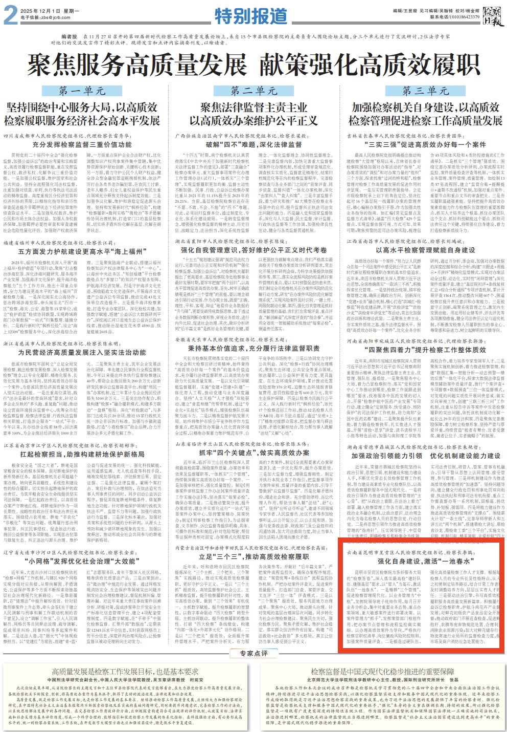 11月27日,第四届新时代检察工作高质量发展论坛在江西南昌召开,最高人民检察院党组副书记、常务副检察长童建明出席论坛。来自15个市县级检察院的主要负责人围绕论坛主题,分三个单元进行了交流研讨。呈贡区人民检察院党组书记、检察长李鹃围绕第三单位主题“加强检察机关自身建设,以高质效检察管理促进检察工作高质量发展”进行交流发言,《检察日报》刊发了发言内容摘要。